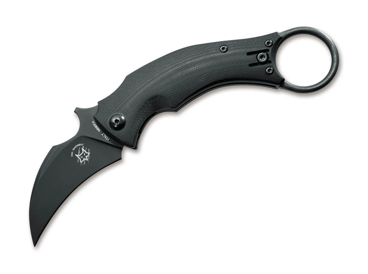 Das Fox Black Bird ist ein kompaktes Kerambit, entworfen vom französischen Custom-Messermacher Bastinelli. Die konturierten schwarzen G10-Griffschalen sorgen für eine ausgezeichnete Ergonomie, und der umsetzbare Clip (Tip-up/l-r) ermöglicht die gewünschte Trageweise. Die Verriegelung erfolgt per Linerlock, die schwarz beschichtete Klinge wird aus N690 gefertigt.