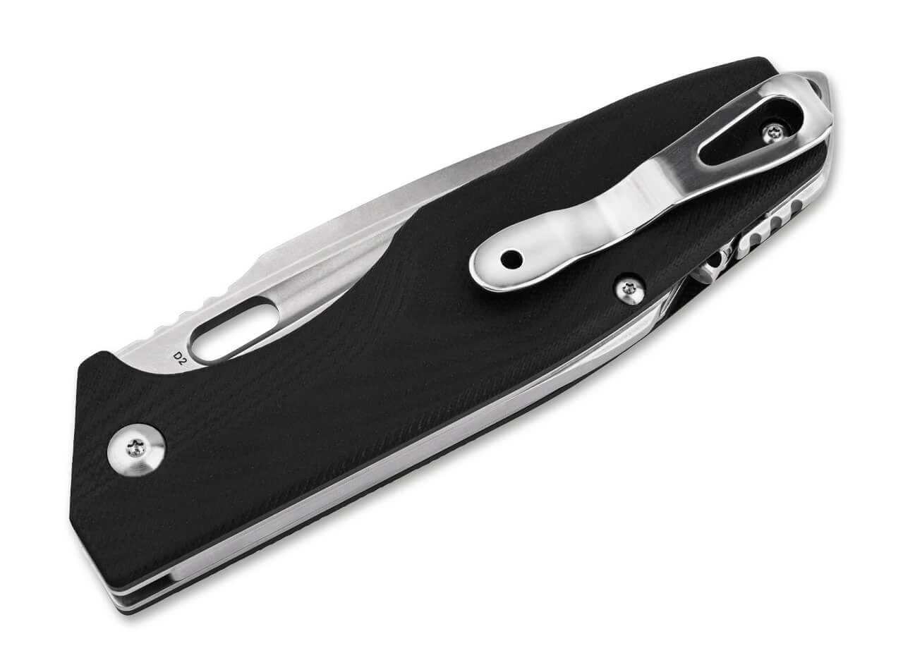 Dieser Sicherungsstift sitzt im Griffrücken im Distanzstück und kann, wenn gewünscht, seitlich in die Bohrung im Griff gesetzt werden, wodurch die Klinge fest und sicher steht. Federbelastete Kugeln halten den Stift an beiden Positionen sicher verankert. Die übrige Ausstattung stimmt mit dem bisherigen Caracal überein: Solide Stahlplatinen mit angenehm konturierten G10– Schalen, eine Klinge aus D2 und der umsetzbare Deep-Carry-Clip (Tip-up/l-r) machen einen vertrauten Eindruck. Mit Edelstahl-Endstück mit Fangriemenöse.
