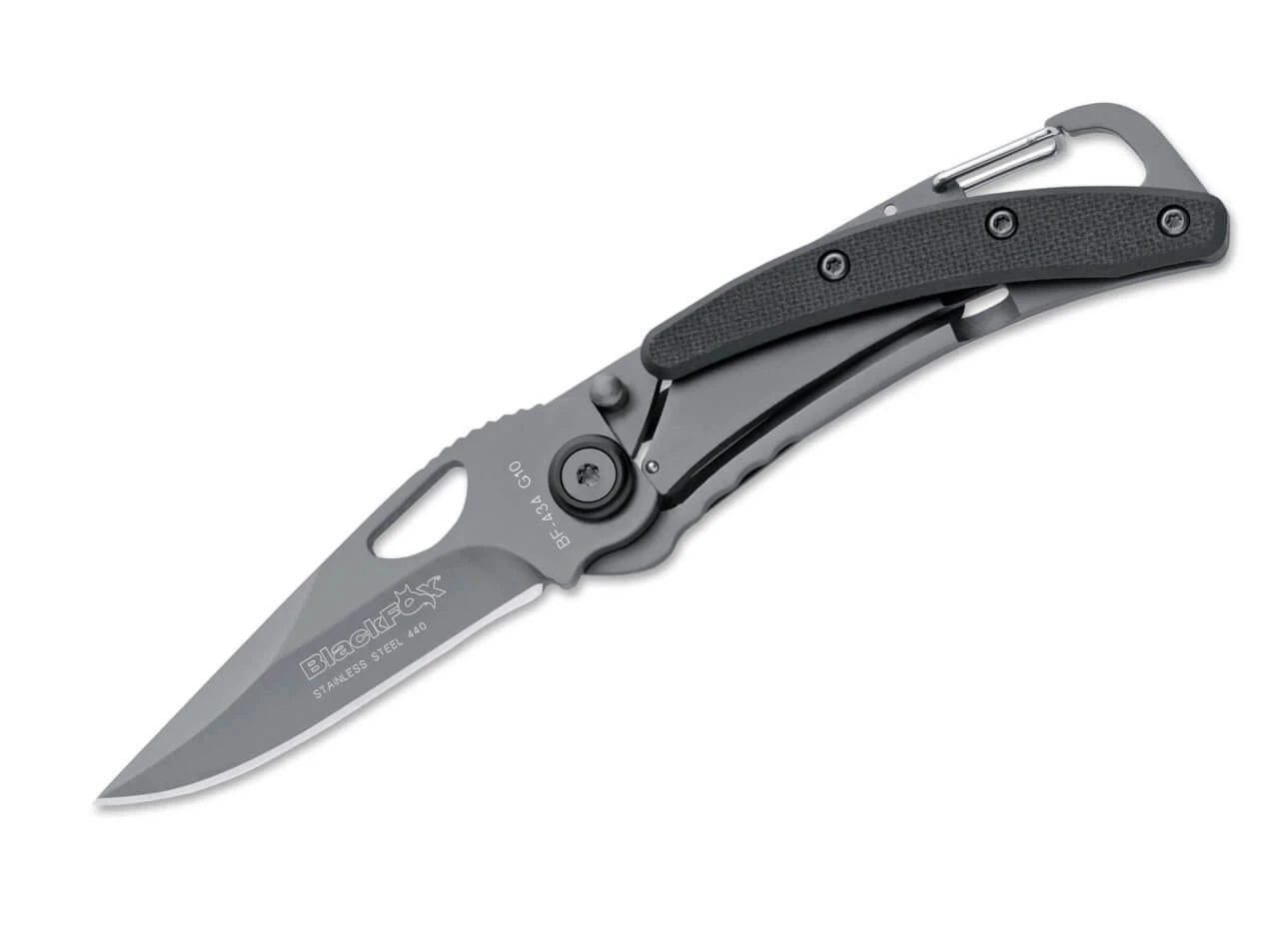 Das Taschenmesser 434 zählt durch seine Skelettbauweise ebenfalls zu den Leichtgewichten unter den Taschenmessern. Der große Clip auf der Rückseite ermöglicht nicht nur bequemes und zugriffsbereites Tragen, sondern auch die Verwendung als Geldscheinklammer. Alternativ kann das BF-434 auch mit dem integrierten Karabiner befestigt werden. Verriegelung per Linerlock. Der Klingenstahl 440A ist ebenso wie die Griffschalen titanbeschichtet.