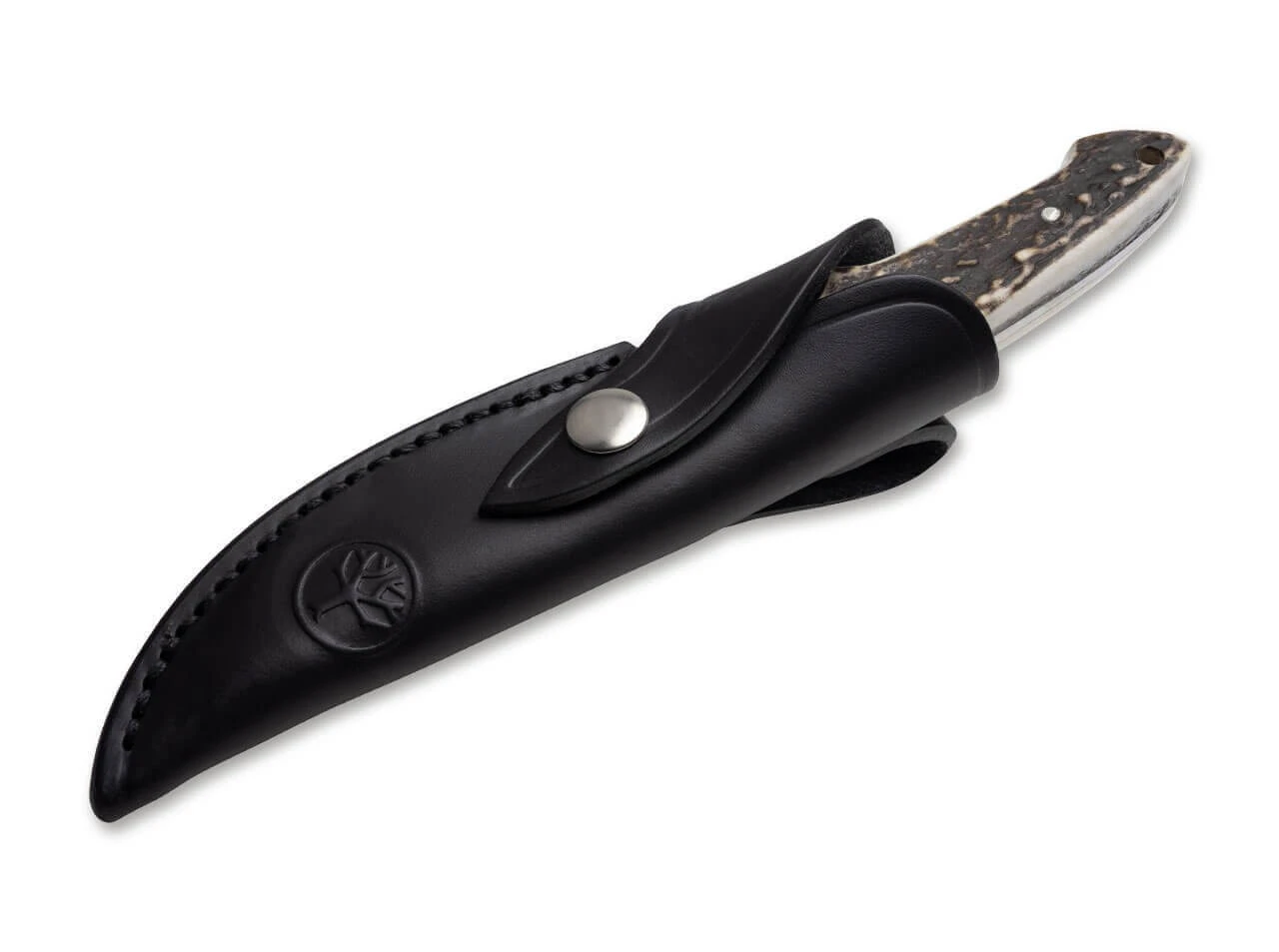 Das Böker Integral II ist die kompakte Version des Vollintegral und wird in der gleichen stabilen Bauweise aus einem Stück Stahl gesenkgeschmiedet. Die stabile Klinge und die ausgezeichnete Ergonomie der Griffschalen aus ausgesuchtem Hirschhorn überzeugen nicht nur im jagdlichen Einsatz. Der nach hinten konisch zulaufende Erl und die von Hand eingeschliffenen Fingermulden unterstreichen die aufwendige Verarbeitung und erhöhen den Griffkomfort deutlich. Die Klinge wird aus dem im Outdoorbereich bestens bewährten 440C gefertigt und ist mit einem Flachschliff versehen, der auch im harten Einsatz hohe Stabilität gewährleistet. Ausgeliefert wird das komplett von Hand in der Böker Manufaktur Solingen gefertigte Messer mit einer hochwertigen Lederscheide.