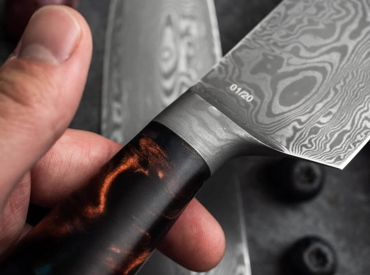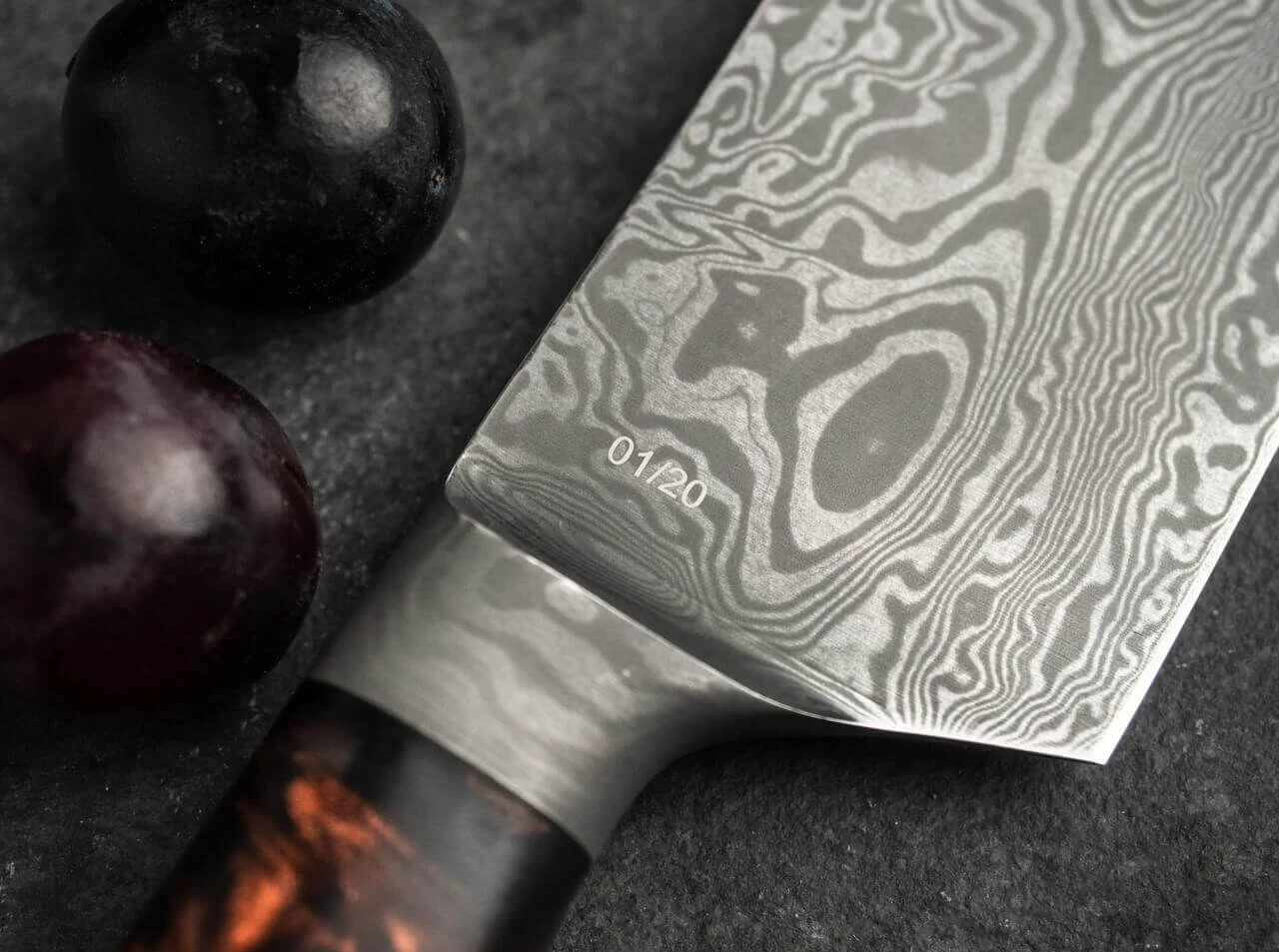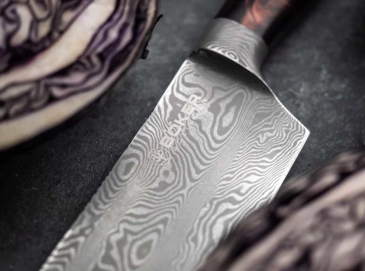 Das faszinierende Böker Interstellar Damast Chefmesser definiert die Gesetze der Gravitation neu und greift nicht nur kulinarisch nach den Sternen. Die edle Damastklinge und der außergewöhnliche Griff versprechen eine spannende Reise durch Raum und Zeit der Kochkunst und machen das Messer nicht nur zu einem begehrten Sammlerstück, sondern garantieren darüber hinaus eine überragende Leistungsfähigkeit für sämtliche Schneidaufgaben in der Küche. Der handgeschmiedete, rostfreie Damast weist nicht nur ein atemberaubendes Muster auf, sondern besticht auch mit seiner hohen Zähigkeit und Härte (60 HRC). Das geschmiedete Spaltstück aus 150 Lagen Damast wird bei uns in Solingen bis zur Rotglut erhitzt und durch einen zwei Tonnen schweren Fallbär im Gesenk in seine wunderschöne Form geschlagen.