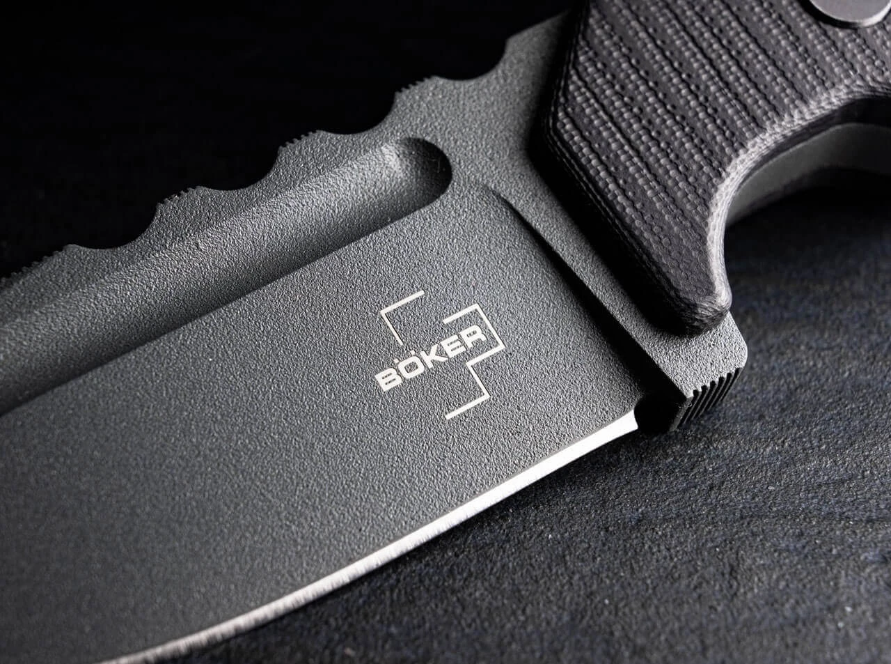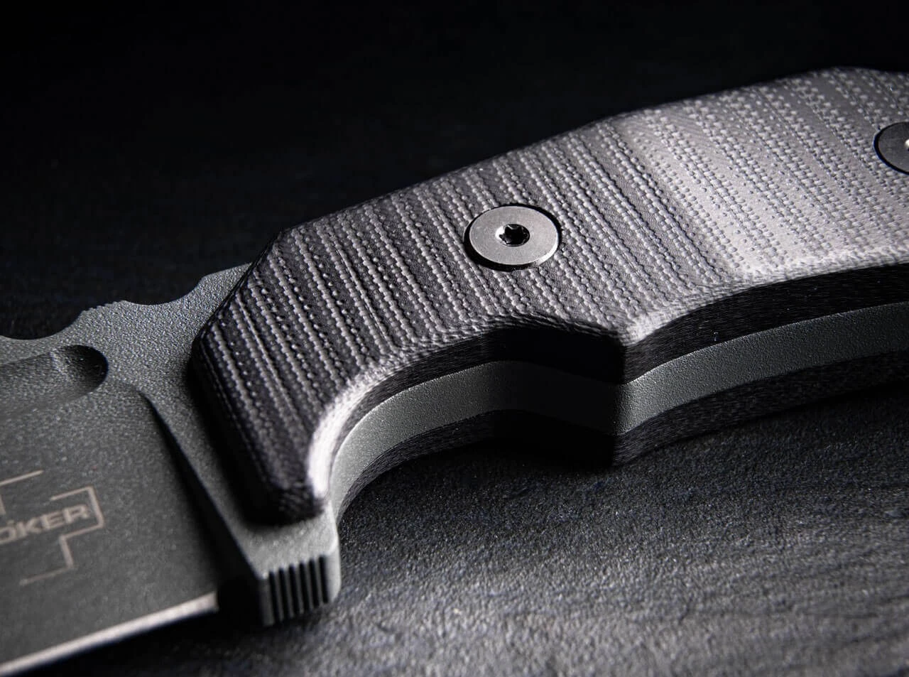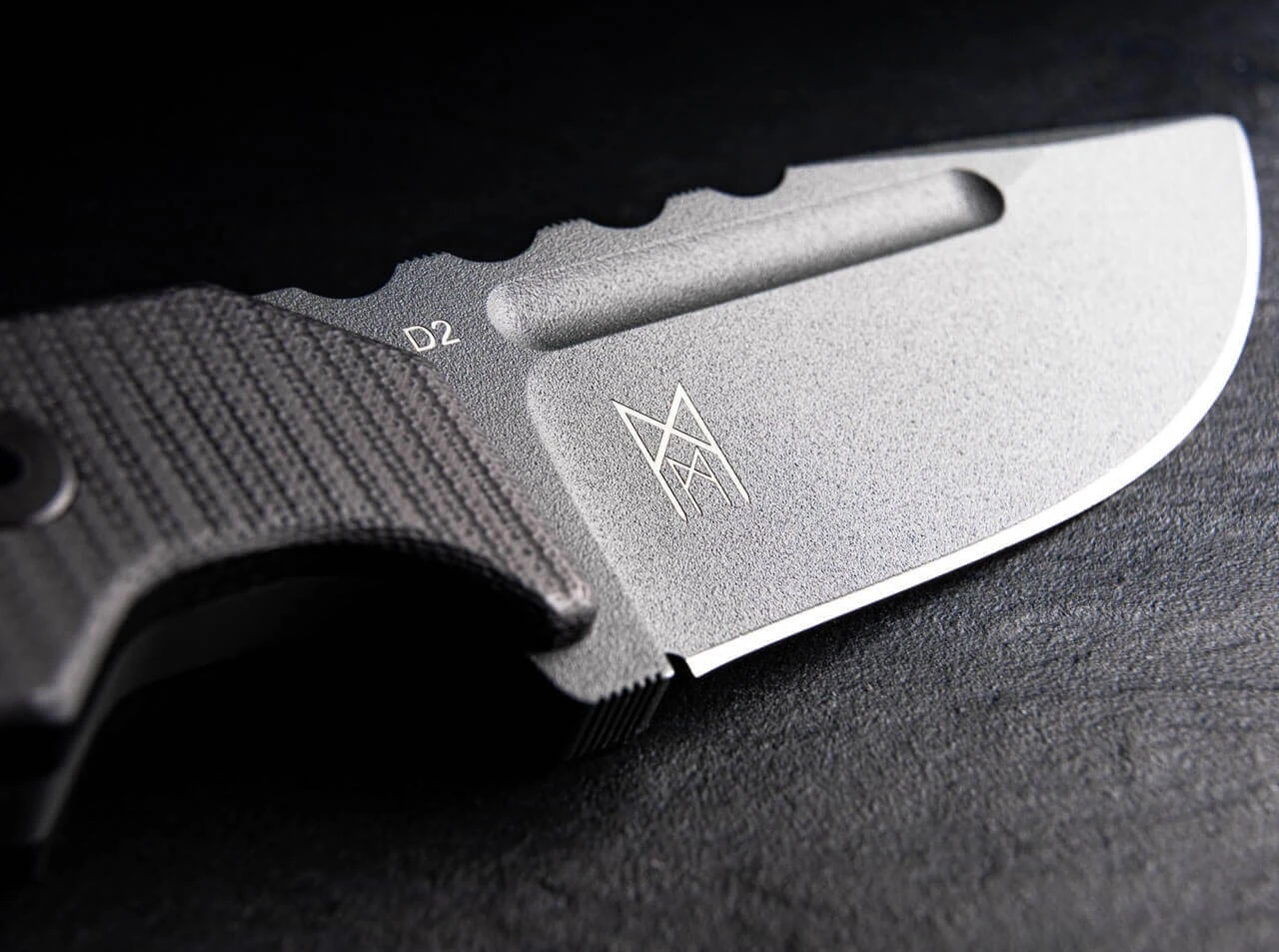 Das feststehende Messer überzeugt mit seiner kompakten Baugröße und wuchtigen Spearpoint-Klinge aus D2, die mit einer dunkelgrauen Titanbeschichtung und einer ausgeprägten Hohlkehle versehen ist. Die Riffelung am Klingenrücken verspricht eine sichere Daumenablage bei schwierigen Schneidarbeiten. Dem Zorn der Götter zum Trotz liegt der wohlgeformte und in Teilen geriffelte Griff aus G10 stets sicher in der Hand. Mit einem handelsüblichen 3D-Drucker lassen sich alternative Griffschalen in den verschiedensten Formen, Farben und Materialien einfach selbst ausdrucken. Mit Fangriemenöse, Gürtelclip und hochwertiger Kydexscheide.
