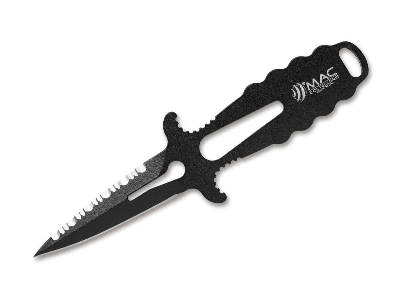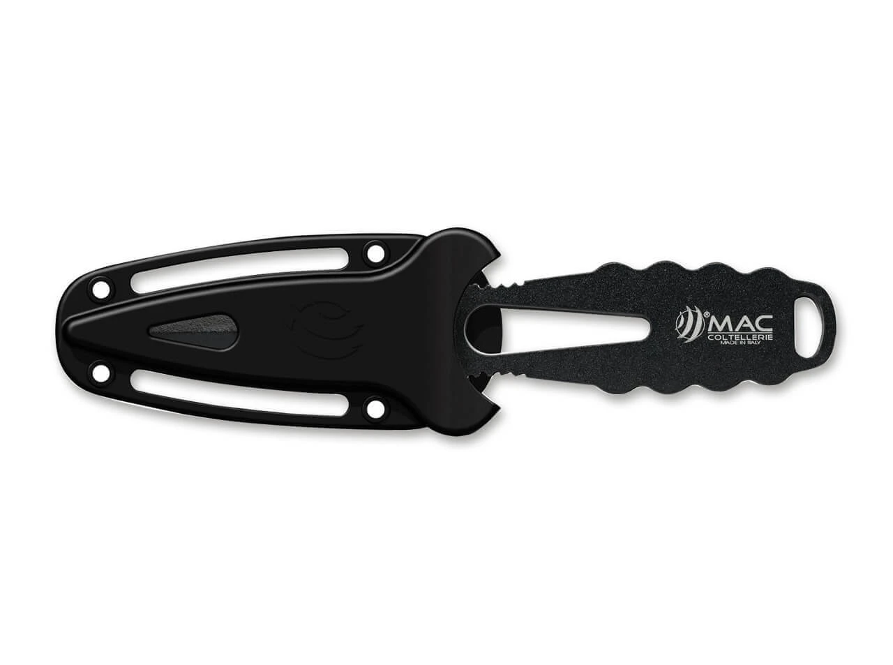 Das MAC Apnea 9 BE ist eine teflonbeschichtete kompakte Ganzstahlkonstruktion aus 4116, mit Schäkellöser und Wellenschliff am Klingenrücken. Die rastende Kunststoffscheide mit Beingurten kann beidseitig getragen werden.