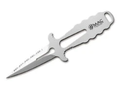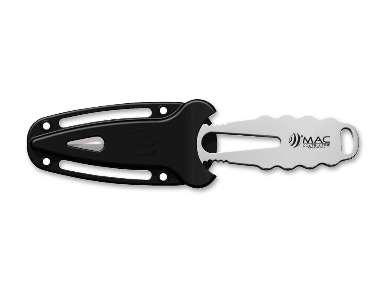 Das MAC Apnea 9 ist eine kompakte Ganzstahlkonstruktion aus 4116, mit Schäkellöser und Wellenschliff am Klingenrücken. Die rastende Kunststoffscheide mit Beingurten kann beidseitig getragen werden.