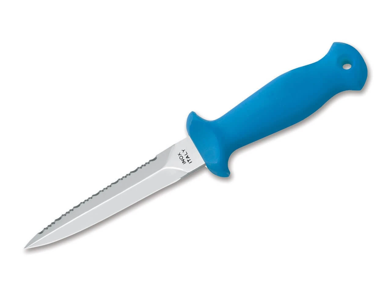 Das professionelle Tauchermesser Sub 11 D von MAC ist mit einer Dolchklinge aus 4116 ausgestattet, die zusätzlich über einen bissigen Wellenschliff verfügt. Der blaue Griff aus rutschfestem TPE liegt auch unter Wasser sicher in der Hand. Lieferung mit PE-Scheide mit Gummibändern für Beine oder Arme.