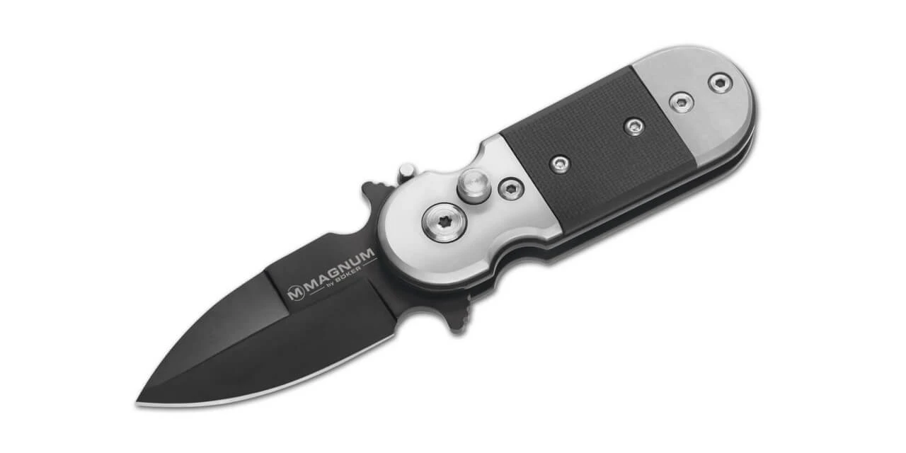 Dieses handliche und klein dimensionierte Springmesser wirkt sehr futuristisch. Der solide verarbeitete Griff besteht aus einer Kombination von gestrahltem Edelstahl und schwarzen G10-Schalen. Die rostfreie 440er Klinge ist geschwärzt und besitzt einen doppelseitigen Handschutz. Eine Sicherung verhindert ein ungewolltes Auslösen der Klinge. Inklusive Taschenclip.