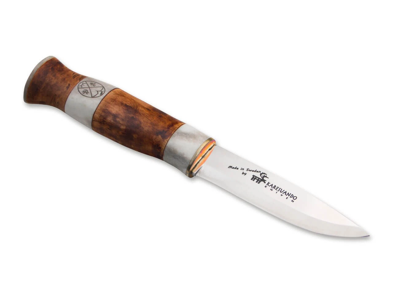 Das klassische Jagdmesser Poromies von Karesuando besitzt einen Griff aus geöltem Maserbirkenholz und echtem Rentierhorn, das als vorderer und hinterer Abschluss Verwendung findet. Zur Klinge hin endet der Griff mit einem Messingabschluss. Die Klinge wird aus 5CR14MoV gefertigt. Mit hochwertiger braunen Lederscheide.