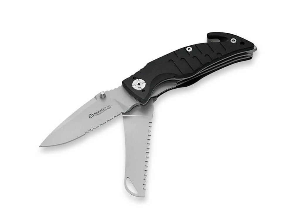 Das Maserin Rescue-2 II ist ein praktisches Rettungsmesser mit Gurtschneider, Glasbrecher und Säge. Die Klinge mit Teilwellenschliff wird aus N690 gefertigt und durch einen Linerlock verriegelt. Als Öffnungshilfe kommt ein klassischer Daumenpin zum Einsatz. Der schwarze Aluminiumgriff ist stark strukturiert und liegt so auch bei Nässe und Feuchtigkeit sicher in der Hand. Mit abnehmbarem Clip.