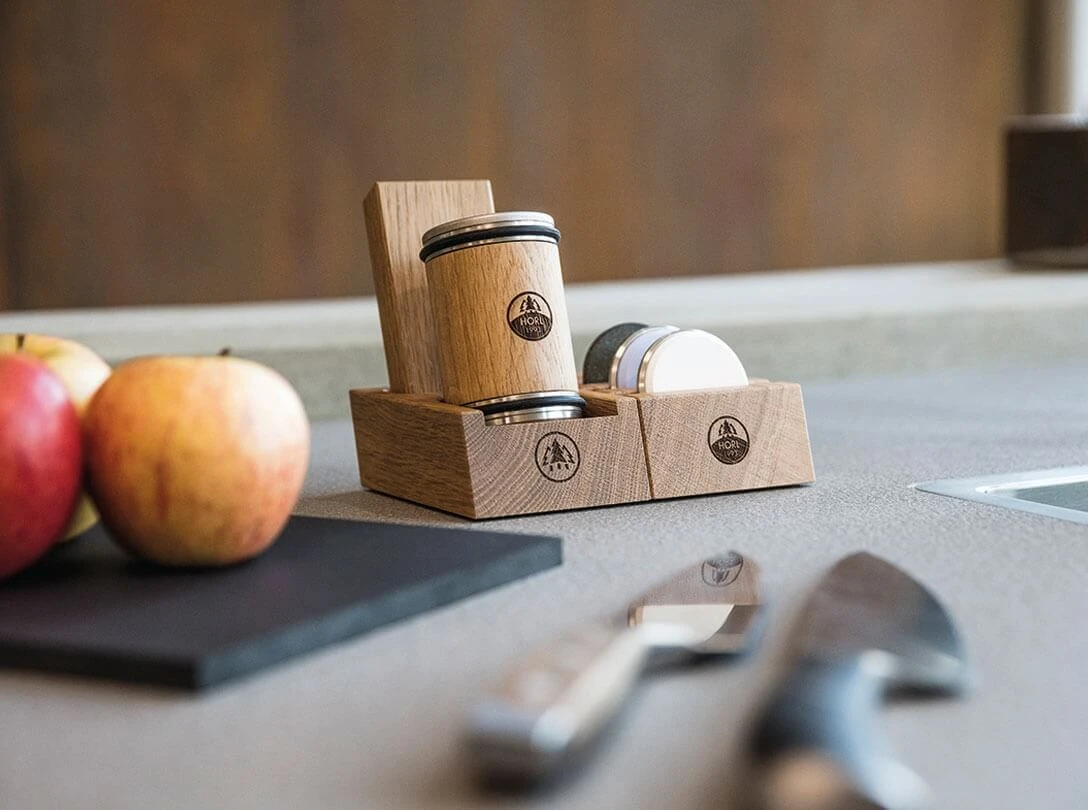 Hochwertige Aufbewahrungsstation für den HORL Rollschärfer und die dazugehörige Magnetschleiflehre. Gefertigt in Deutschland aus massivem Eichenholz.