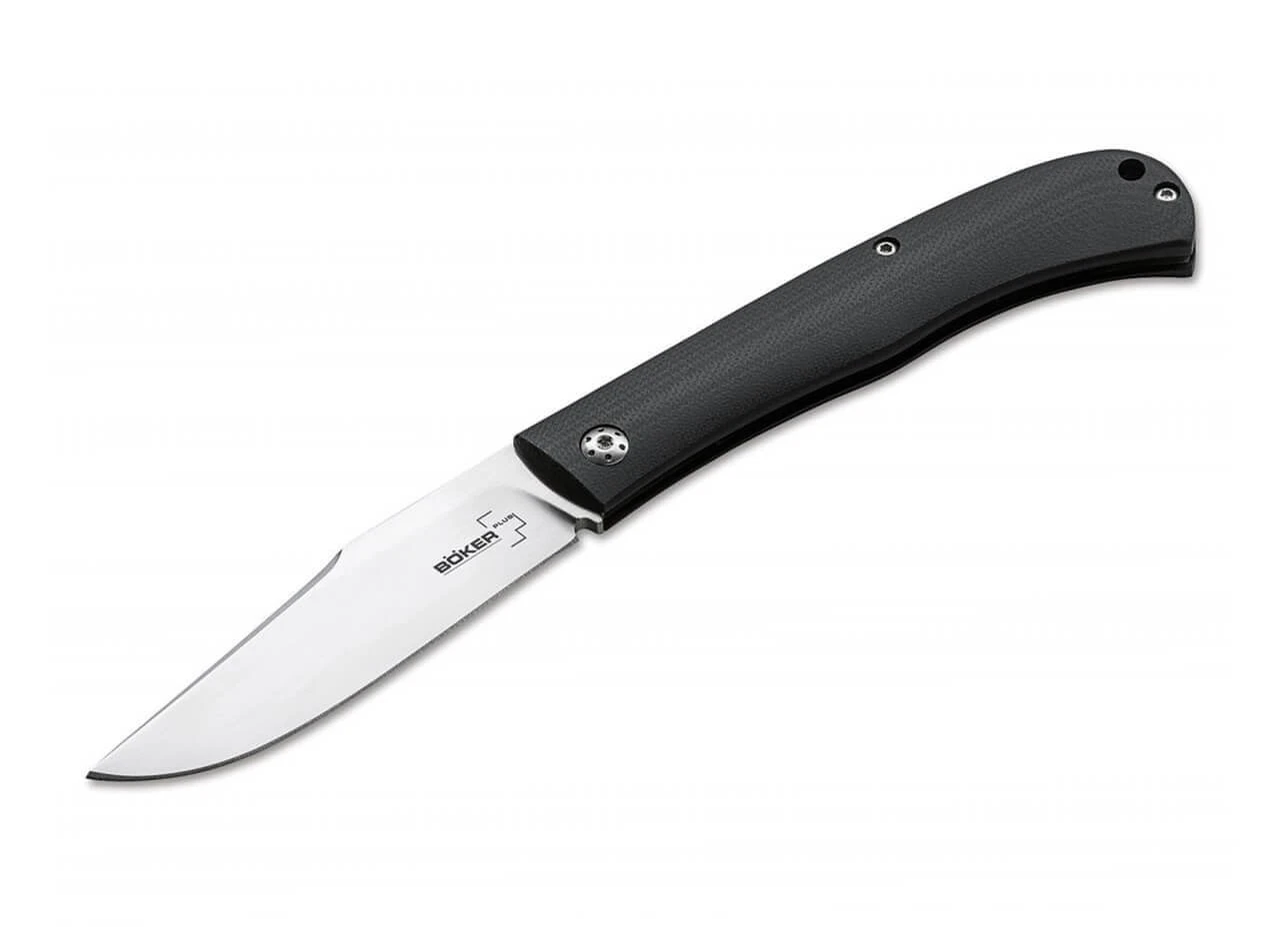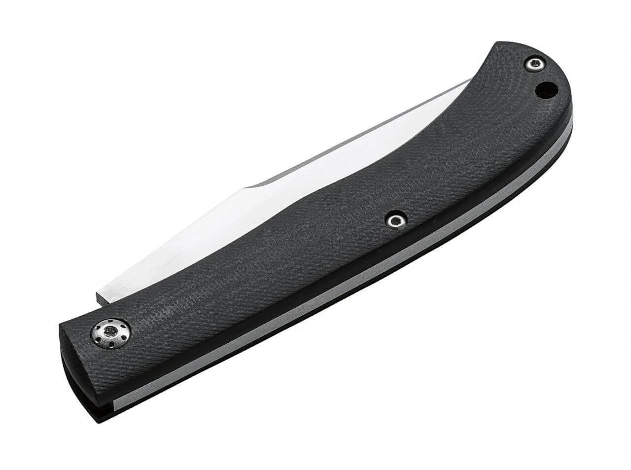 Das Böker Plus Slack des französischen Messermachers Raphaël Durand geht, wie viele klassisch-französischen Taschenmesser, auf die traditionellen Navajas aus dem Mittelmeerraum zurück. Raphaël Durand transponiert diese Bauform allerdings in ein modernes Konzept. So kommt für den überaus schlank gehaltenen Griff des Gentleman-Taschenmessers eine Beschalung aus G10 zum Einsatz, die die tragenden Edelstahlplatinen beherbergen. Großzügige Bohrungen in den Platinen senken das Gewicht und steigern den Tragekomfort. Die Klinge des Slipjoint-Messers besteht aus VG-10 und ist mit einer edlen horizontalen Satinierung versehen. Mit Fangriemenöse und ohne Clip.