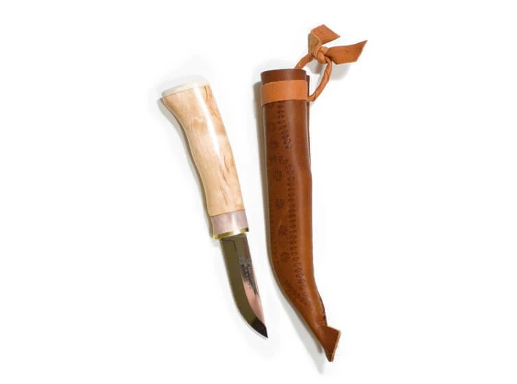 Messergriff aus Maserbirke und Rentierhorn, Klinge 18 x 75 mm aus rostfreiem Sandvik-Stahl 12C27, gehärtet auf 57HRC. Messerscheide aus Rinderleder mit Kunststoffeinlage.