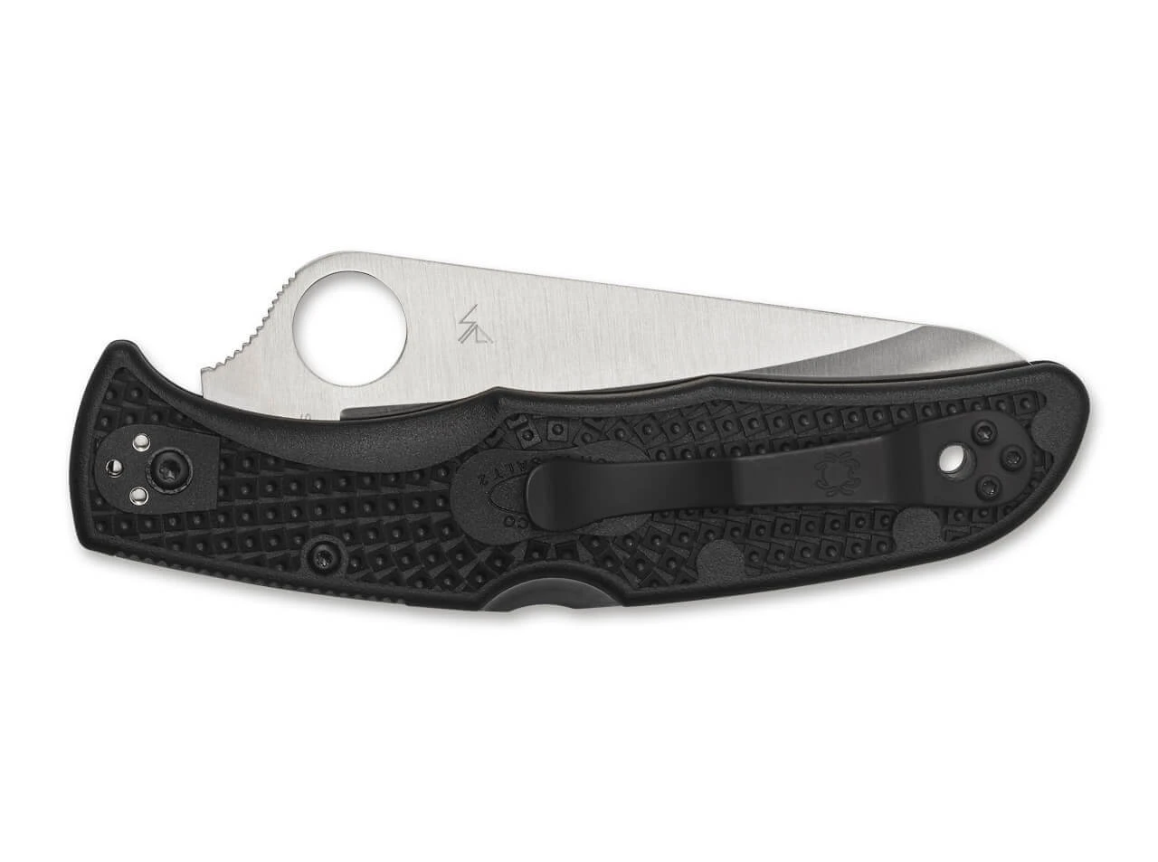 Das überarbeitete Spyderco Pacific Salt 2 ist ein speziell für den maritimen Einsatz entwickeltes Taschenmesser mit einer Wellenschliff-Klinge aus H1, das sogar dauerhaft im Salzwasser eingesetzt werden kann. Der in Japan entwickelte Stahl verbindet extreme Korrosionsbeständigkeit mit sehr guter Schnitthaltigkeit und weist eine Härte von 57 bis 58 HRC auf. Griffstruktur und Griffergonomie wurden im Vergleich zur Ursprungsversion deutlich verbesserst. Von den Abmessungen und dem Design ist das Taschenmesser mit dem Endura vergleichbar, hat jedoch eine etwas stärker gerundete Spitze. Auch die anderen Stahlteile des Messers wurden speziell behandelt um sie rostbeständiger zu machen. Der texturierte Griff aus FRN, der Backlock und das vergrößerte SpyderHole vereinfachen die Bedienung mit Handschuhen. Mit vierfach umsetzbarem Titanclip.