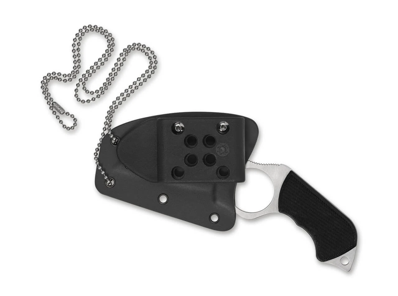 Das Swick 5 stammt aus der Feder von Spyderco Gründer Sal Glesser, welcher die bahnbrechenden Innovationen des französischen Messermachers Fred Perrin für dieses feststehende Messer aufgriff. Das Messer wurde speziell für die Selbstverteidigung konzipiert und verfügt über ein großes Loch für den Zeigefinger, womit eine noch sicherere Handhabung erfolgt. Die Wharncliffe-Klinge mit Wellenschliff besteht aus LC-200N und läuft in den pistolenartigen Griff aus G10 formschön über. Mit Boltaron-Scheide und Fangriemenöse.
