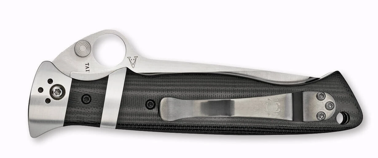 Ein sehr eigenes Design stammt aus der Federvon Butch Vallotton. Mit dem Subhilt hat er ein Messer geschaffen, das auch innerhalb des Spyderco-Programms eine Sonderstellung einnimmt. Das geradlinige Design weist eine ausgezeichnete Ergonomie auf und begeistert mit hoher Vielseitigkeit. Die Klinge ist hohlgeschliffen, weist im Bereich der Spitze jedoch einen balligen Schliff für mehr Stabilität auf. Der für Spyderco sehr untypische Daumenknopf dient gleichzeitig auch als Klingenanschlag. Die Micartaeinlagen sitzen passgenau zwischen den gebürsteten Edelstahlbacken. Vierfach umsetzbarer Clip. Linerlock.