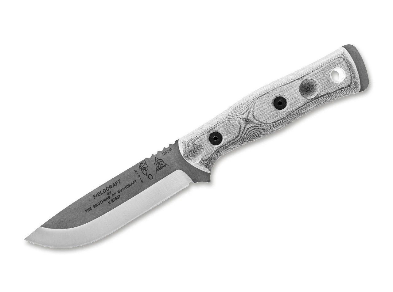 Die robuste Klinge des Fieldcraft ist rund 12 Zentimetern lang und wird aus 154CM gefertigt. Sie wird mit einer widerstandsfähigen Beschichtung versehen und so vor Korrosion und Umwelteinflüssen geschützt. Der Scandi-Schliff und die satinierten Schnittkante machen das Messer zu einem echten Multitalent. Das mit einer Beschalung aus hellgrauem Micarta versehene Outdoormesser liegt dank der ergonomischen Griffform und der feinen Texturierung zudem stets sicher in der Hand. Riffelungen am Klingenrücken erhöhen darüber hinaus die Griffigkeit.